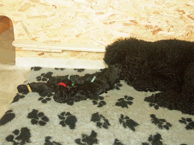 Nach dem 8 Welpen haben wir uns überlegt, Tosca dazuzulassen, um Jette zu entlasten. Pudel haben nur 8 Zitzen (die meisten Hunde 10) und von den 10 Welpen blieben immer zwei unversorgt. Natürlich füttern wir auch zu, aber der Versuch, Tosca als Amme für 3-4 Welpen mit einzusetzen, hat sich angeboten. So brauchten wir Tosca auch nicht immer vom Wurf auszugrenzen.