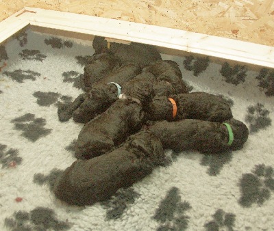 Wir nutzen erstmals zur Welpenkennzeichnung schmale Welpen-Kletthalsbänder. Für die Gewichtskontrolle ist die Kennzeichnung zunächst nur vorläufig, da wir noch nicht wissen, ob wir mit den gleichen Farben über die 8 Wochen kommen. Welpen mit gleichen Farben sind Hündin und Rüde. Mit etwa 3 Wochen müssen wir größere Halsbänder anlegen und dann bleibt die farbliche Kennzeichnung.
